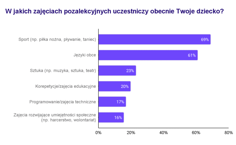 Najczęstszą motywacją jest rozwój pasji – wskazuje ją niemal 60 proc. badanych. Rodzice chcą, by dziecko nie tylko uczyło się „czegoś pożytecznego”, ale też czerpało z tego radość i poczucie sprawczości. Co drugi z nich zaznacza, że liczy się również aktywność fizyczna i kontakt z rówieśnikami, a 36 proc. traktuje zajęcia – zwłaszcza językowe – jako długofalową inwestycję w przyszłość.